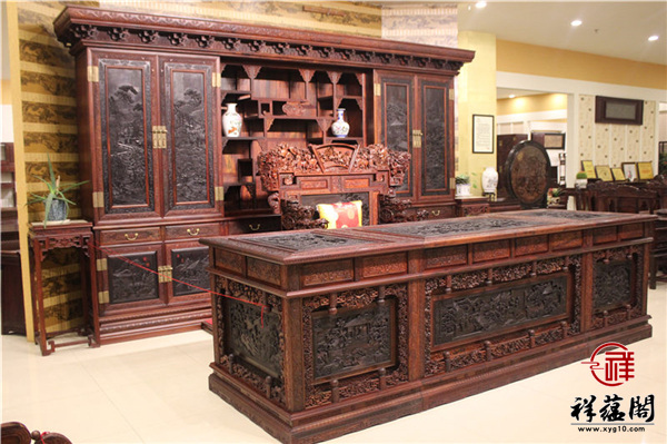 印尼黑酸枝豪华办公桌书柜组合,市场参考价:39万元;其中红木家具两组合书柜16.18万元;