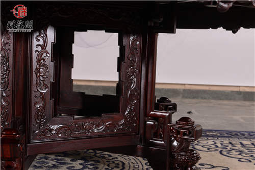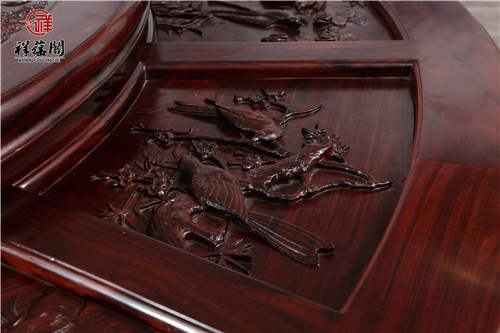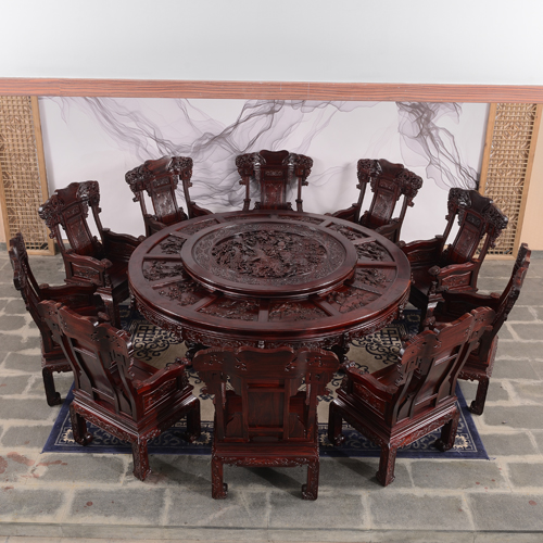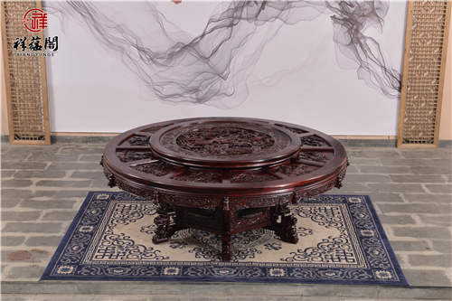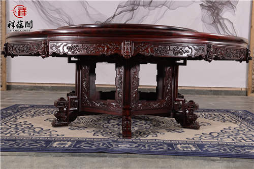 这款红木餐桌摆放在客厅中十分的华贵优美,其桌面雕工奢华精湛大气磅礴,这款餐桌的雕功代表了祥蕴阁最高的雕刻水平。亲朋好友来家里聚会吃饭,用上这面桌子都让主人分外的有面子。