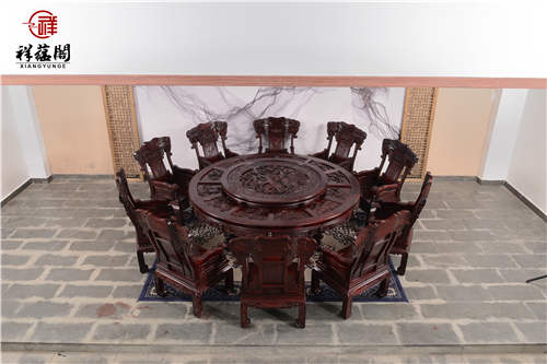 这款产品 名称叫 黑酸枝木餐桌豪华大圆台YZ-001,是我们祥蕴阁热销红木餐桌产品之一