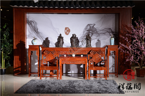 这款产品名称叫黄花梨木家具 黄花梨木中堂,是我们祥蕴阁热销红木中堂产品之一