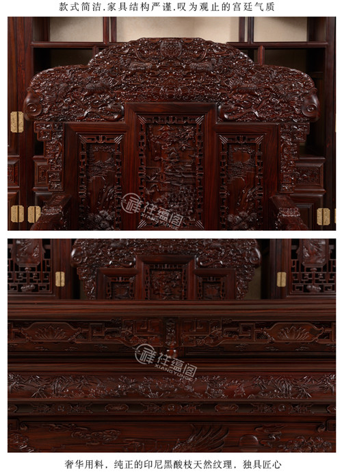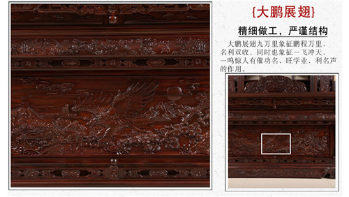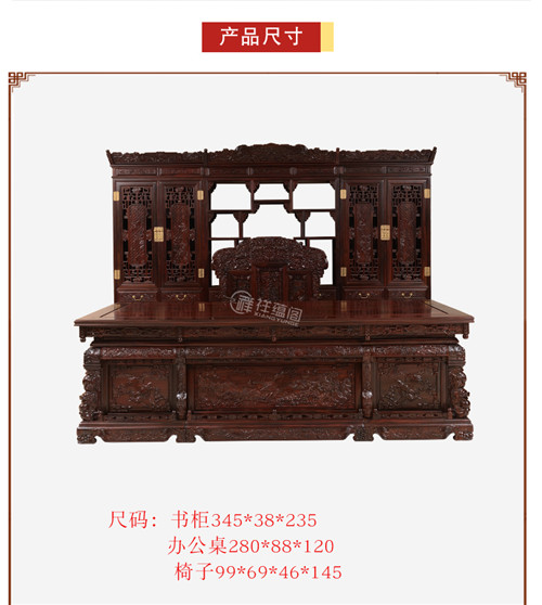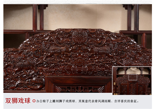 红木办公桌中式实木书柜书房家具,错综复杂豪华雕刻的书桌座椅书柜,形成了最完美的搭配,上面的大鹏展翅,遨游飞翔,意气风发,美不胜收。鲲之大不知几千里也,化身为鹏,扶摇而飞,一跃九万里也。办公椅子上双狮戏球寓意吉祥,双狮形象吉利,寓意喜事到来,好运接憧而至。这款纯正的印尼黑酸枝红木办公桌中式实木红木书柜书房家具,用料奢华,选材昂贵,美不胜收。